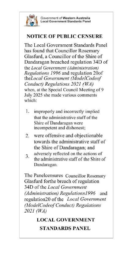 The Local Government Standards Panel has found that Councillor Rosemary Glasfurd, a Councillor of the Shire of Dandaragan breached regulation 34D of the Local Government (Administration) Regulations 1996 and regulation 20 of the Local Government (Model Code of Conduct) Regulations 2021 (WA) when, at the Special Council Meeting of 9 July 2025 she made various comments which: